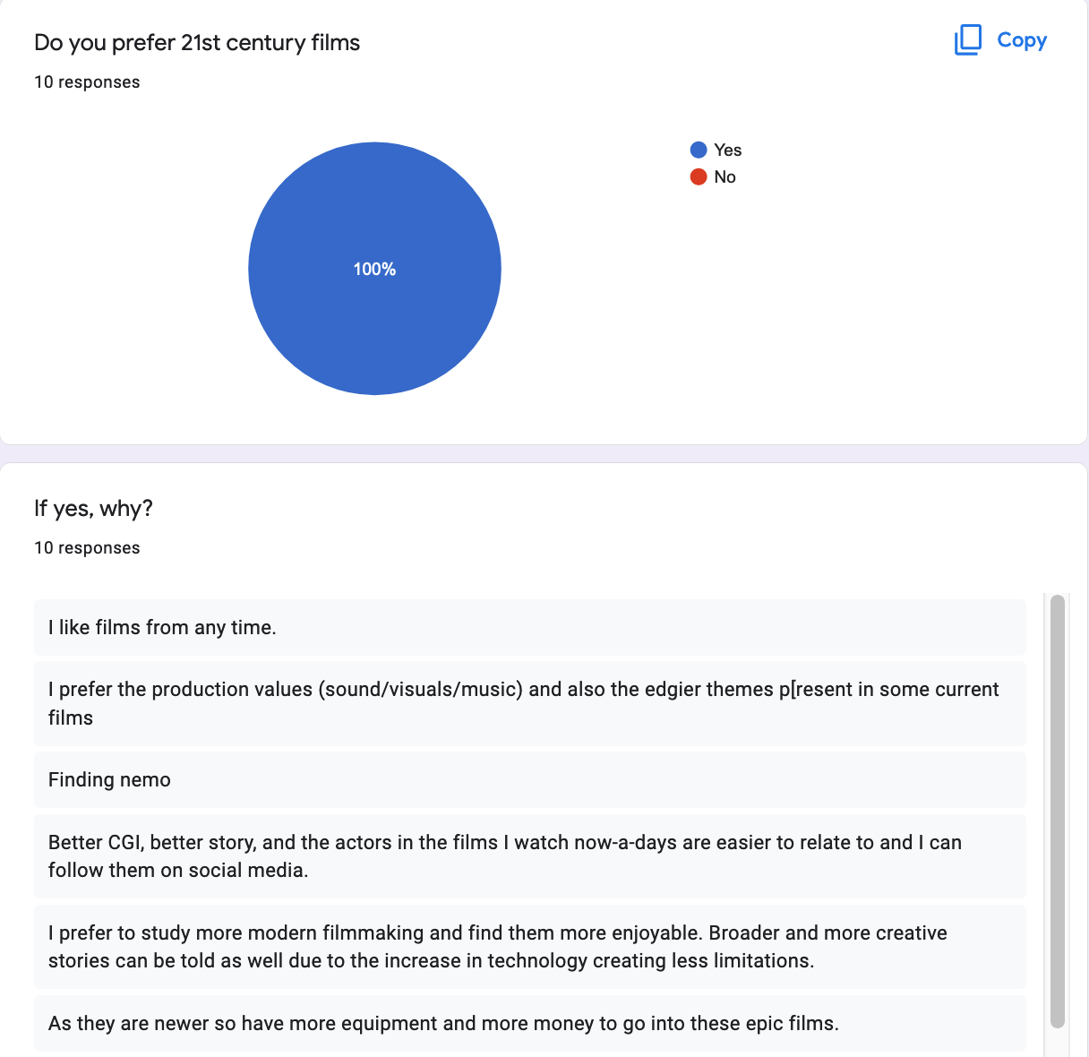 This my version of primary research, which is a survey about what the class thinks of the Golden Age of Hollywood compared to 21st Century films. From the results it look like more than half of the class haven't or might have watched a Golden Age of Hollywood film and everyone said they prefer 21st Century films because of the quality of acting or better CGI and easy to relate to the actors. They also feel the production side is better today than in the Golden Age of Hollywood which I agree the film production has definitley evolved quite well, the visuals in today films especially 2016 onwards has and I'm sure it will evolve and experiment more over the years . I then asked a question which is one of my questions in my documentary which I feel is quite a debatable question and I wanted to know other people opinions because films today are 3 hours long whereas in the Golden Age of Hollywood their were long films but not as many as you get today and the short ones were an hour and a half maybe 2 hours.
