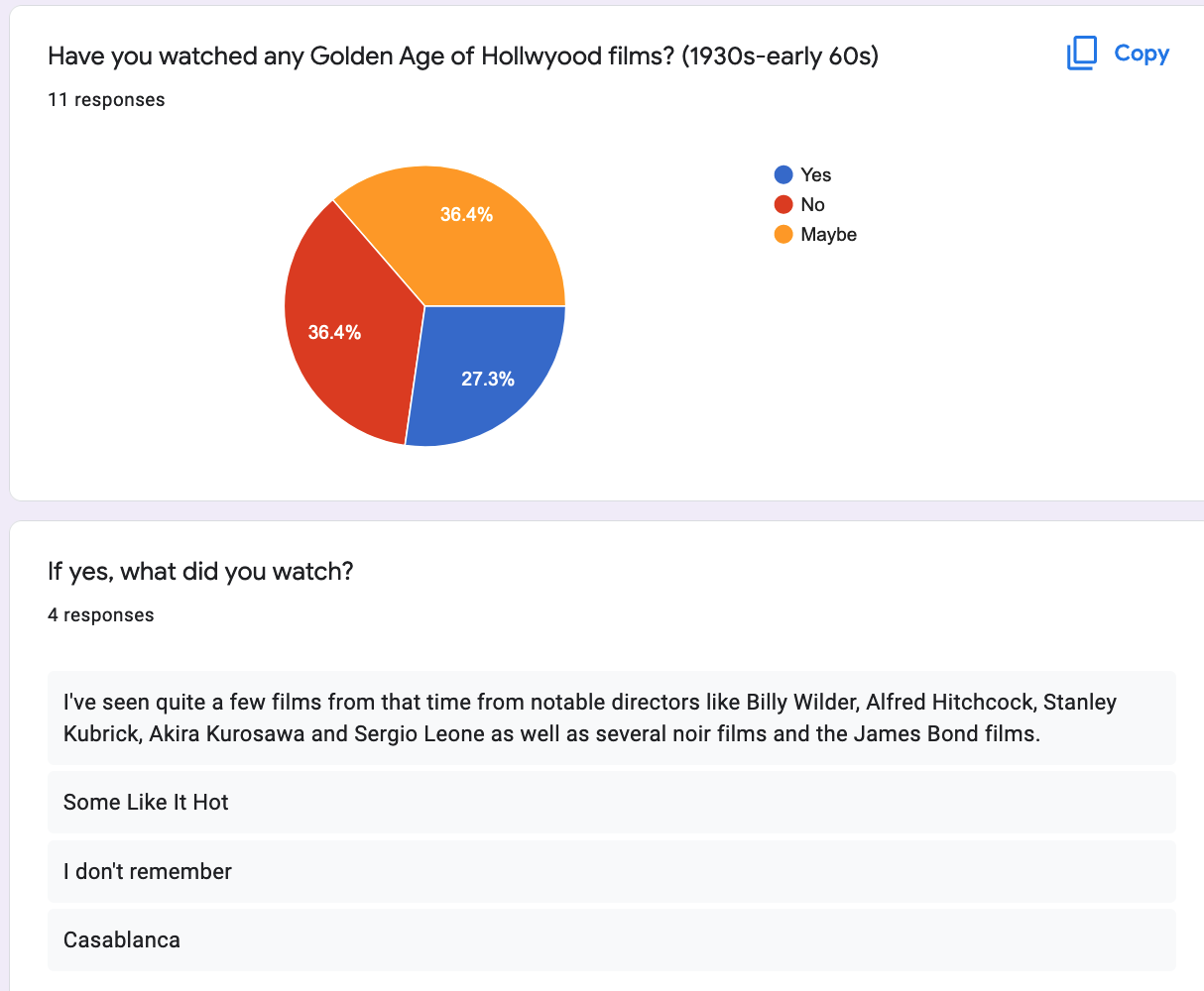 This my version of primary research, which is a survey about what the class thinks of the Golden Age of Hollywood compared to 21st Century films. From the results it look like more than half of the class haven't or might have watched a Golden Age of Hollywood film and everyone said they prefer 21st Century films because of the quality of acting or better CGI and easy to relate to the actors. They also feel the production side is better today than in the Golden Age of Hollywood which I agree the film production has definitley evolved quite well, the visuals in today films especially 2016 onwards has and I'm sure it will evolve and experiment more over the years . I then asked a question which is one of my questions in my documentary which I feel is quite a debatable question and I wanted to know other people opinions because films today are 3 hours long whereas in the Golden Age of Hollywood their were long films but not as many as you get today and the short ones were an hour and a half maybe 2 hours.