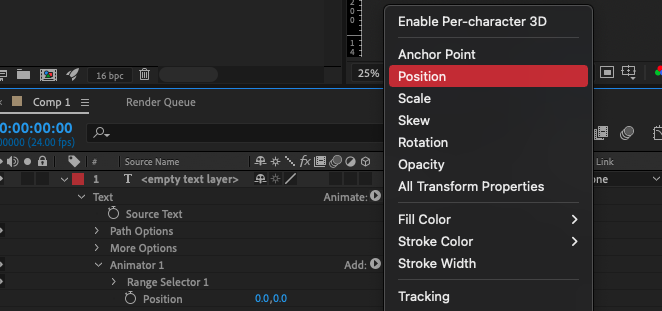 I started off by adding a 4-colour gradient as the background and changed the colours. I added the text and made sure the text was in the middle and moved the position of the text using a keyframe animation I made it move from one direction to the middle. I used the keyframe animation again and made the text opaque which gradually became visable when the text moved to the middle.